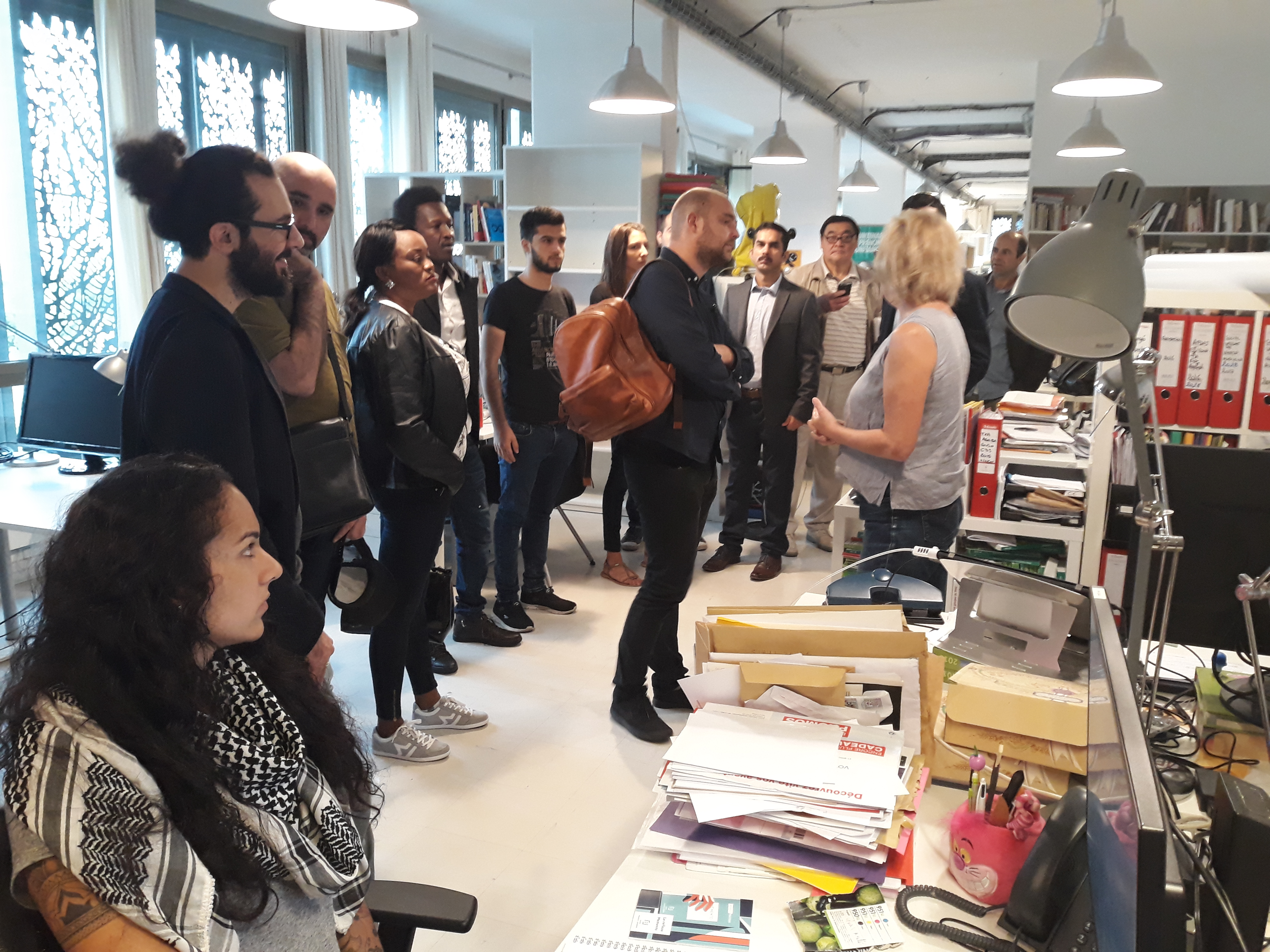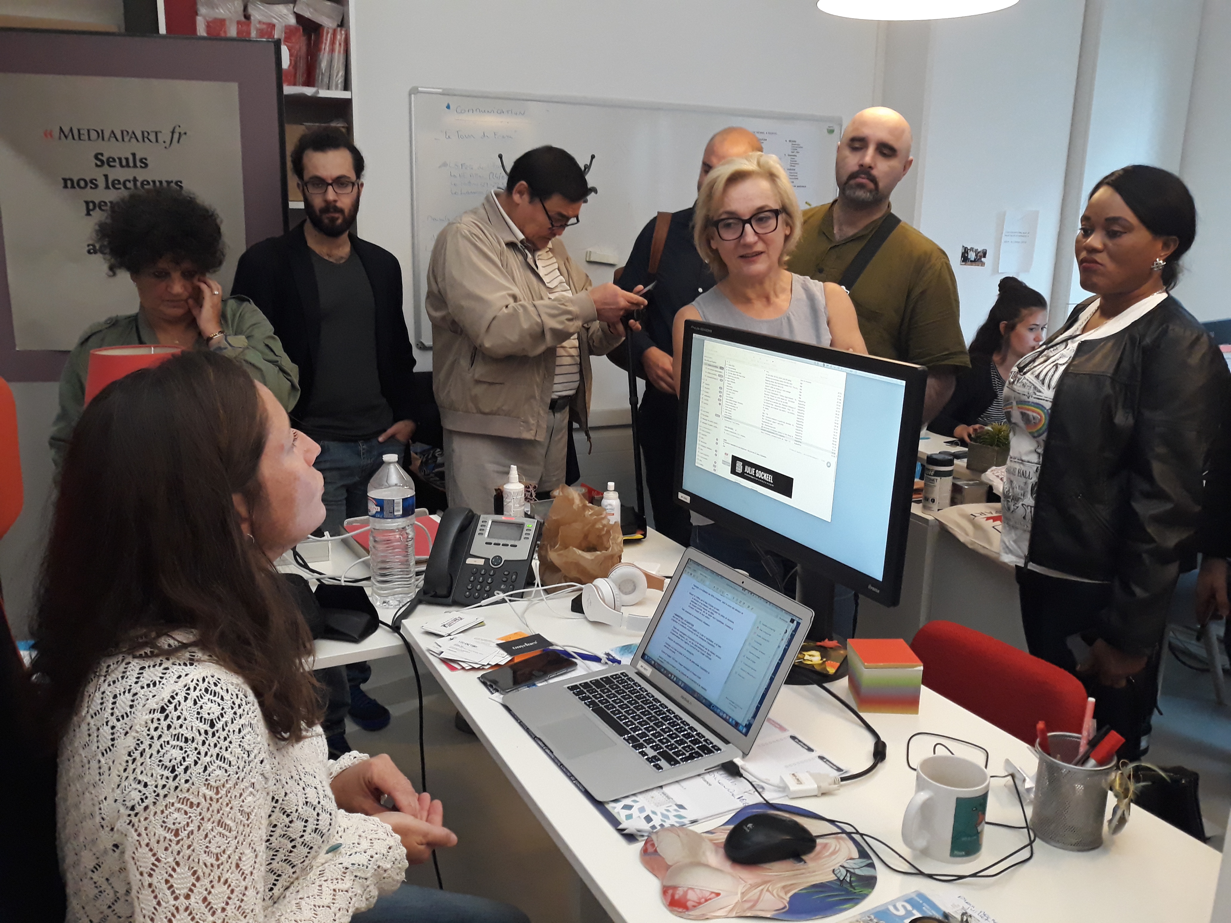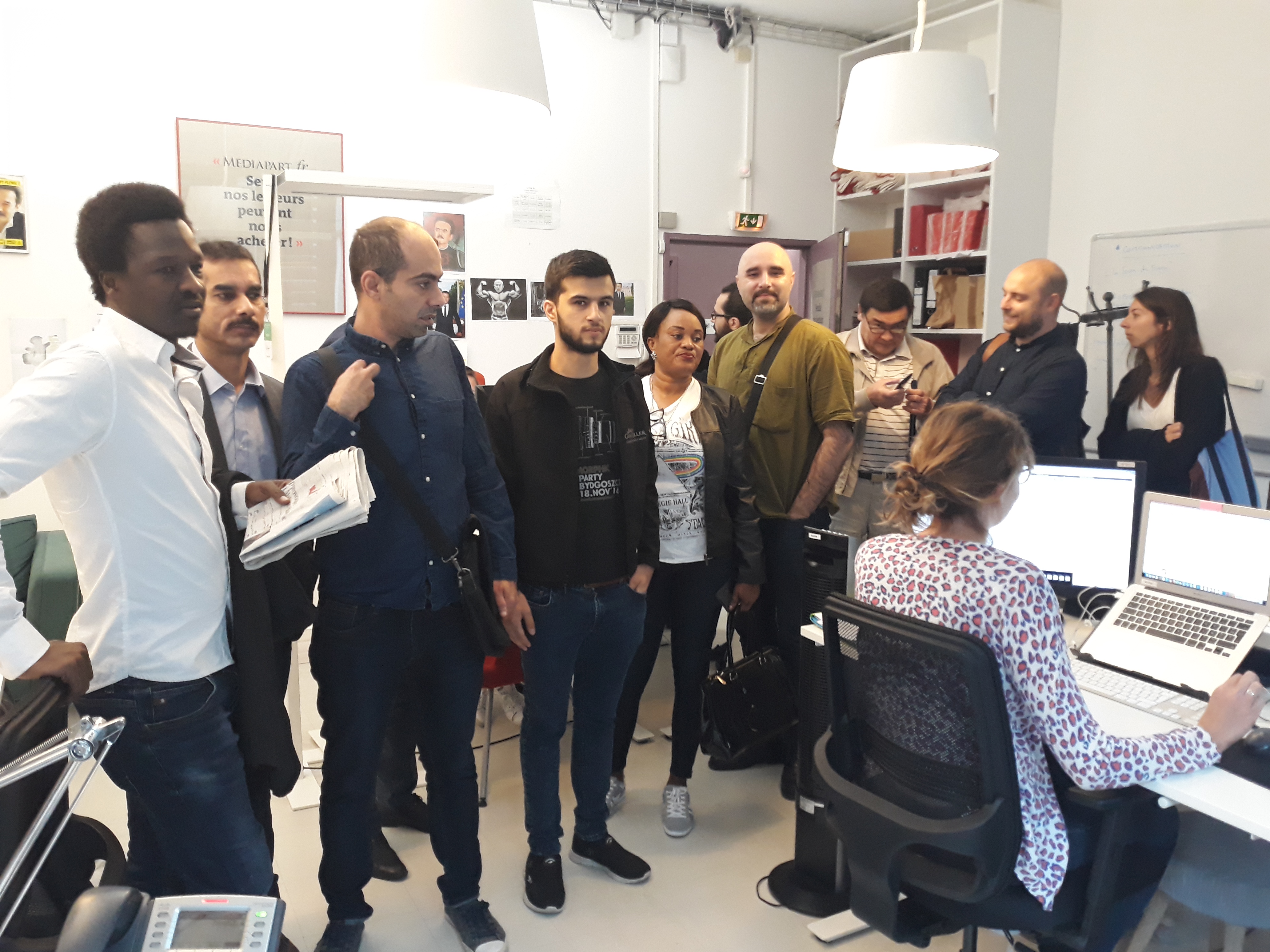 Une délégation d’une douzaine de journalistes en exil a été accueillie et accompagnée en visite des trois étages de la rédaction du 8 passage Brûlon, dans le 12ème arrondissement de Paris, par Sophie Dufau, rédactrice en chef adjointe de Mediapart et Lorraine Melin, chargée des services généraux du média.