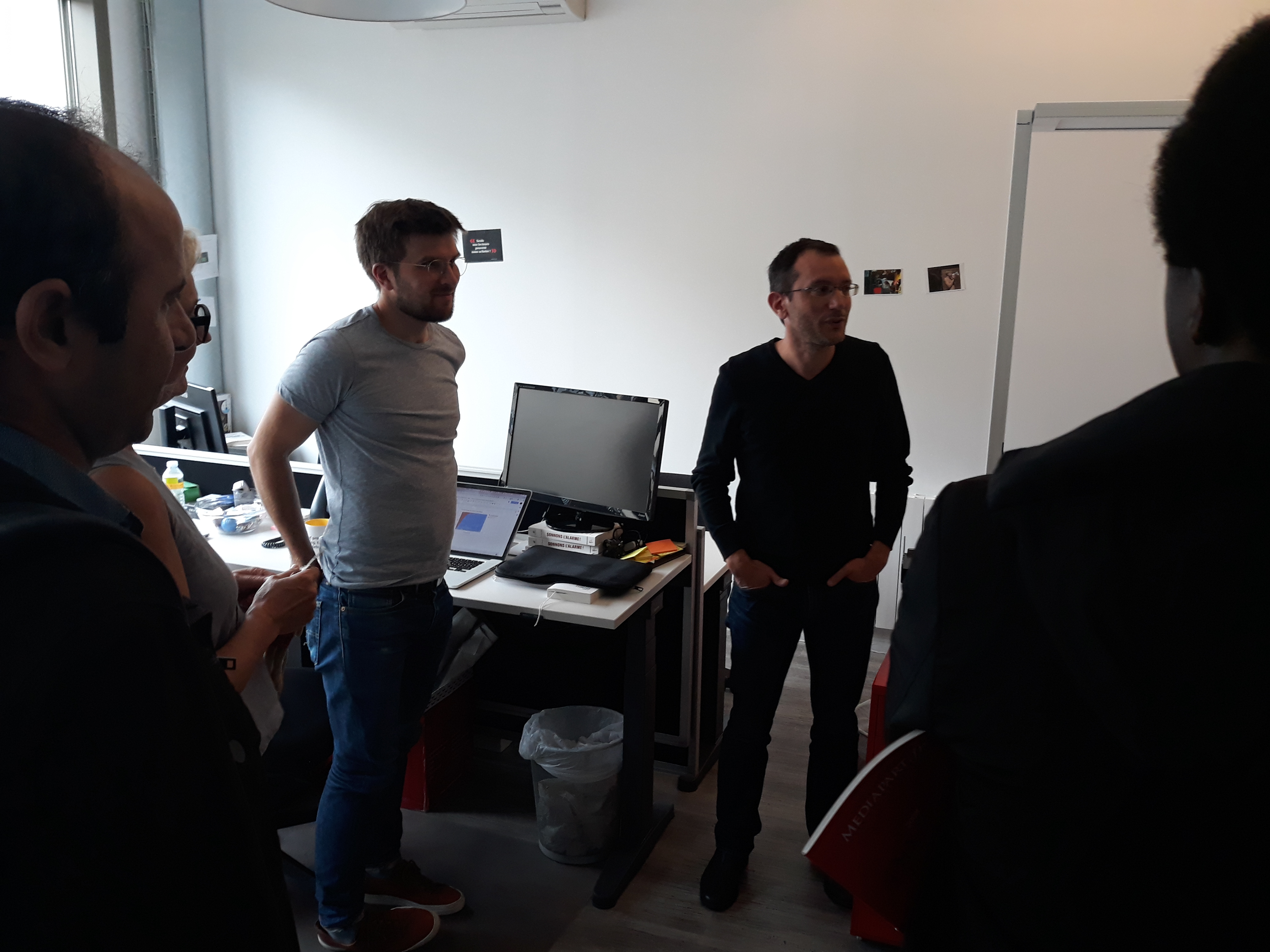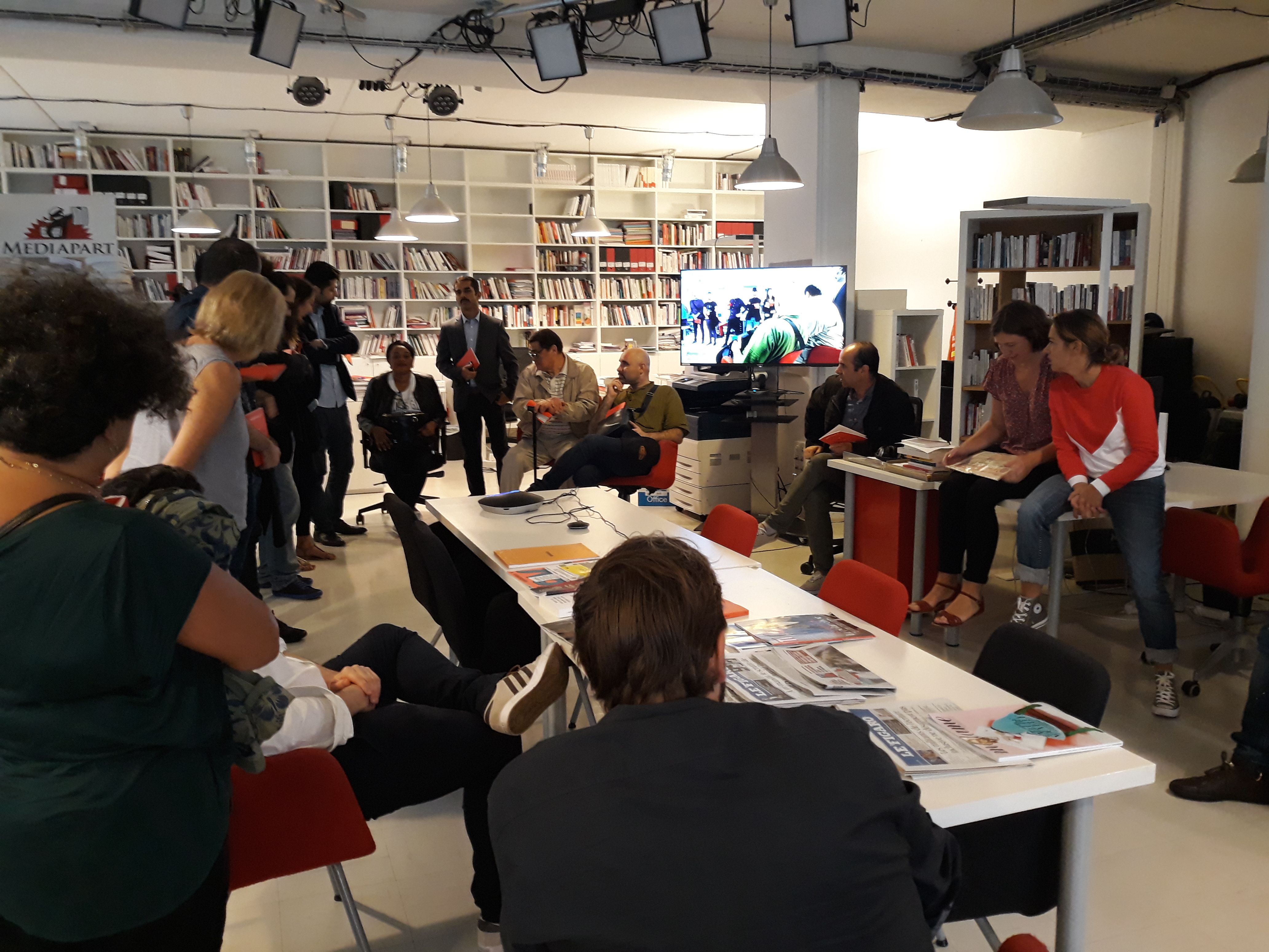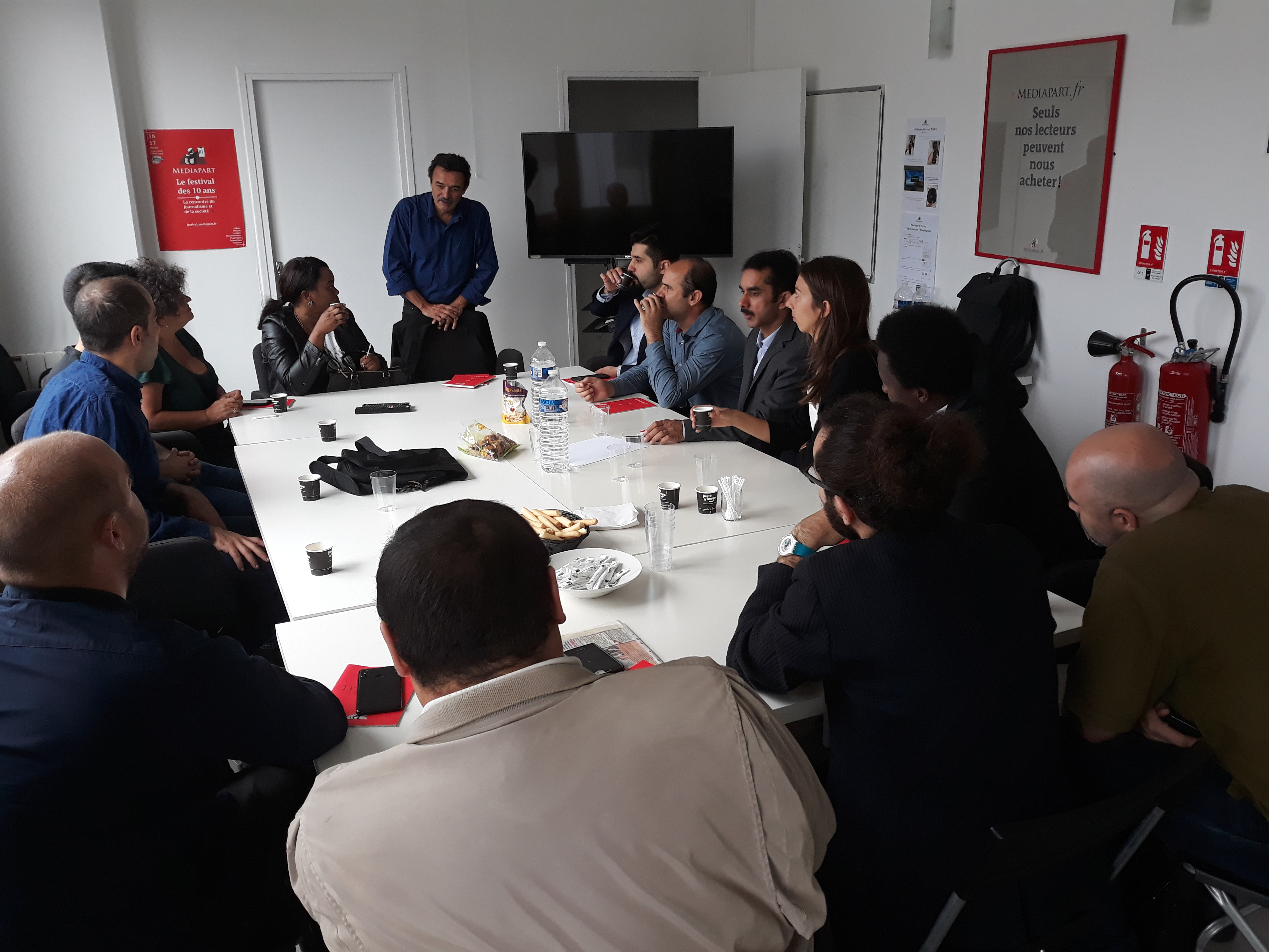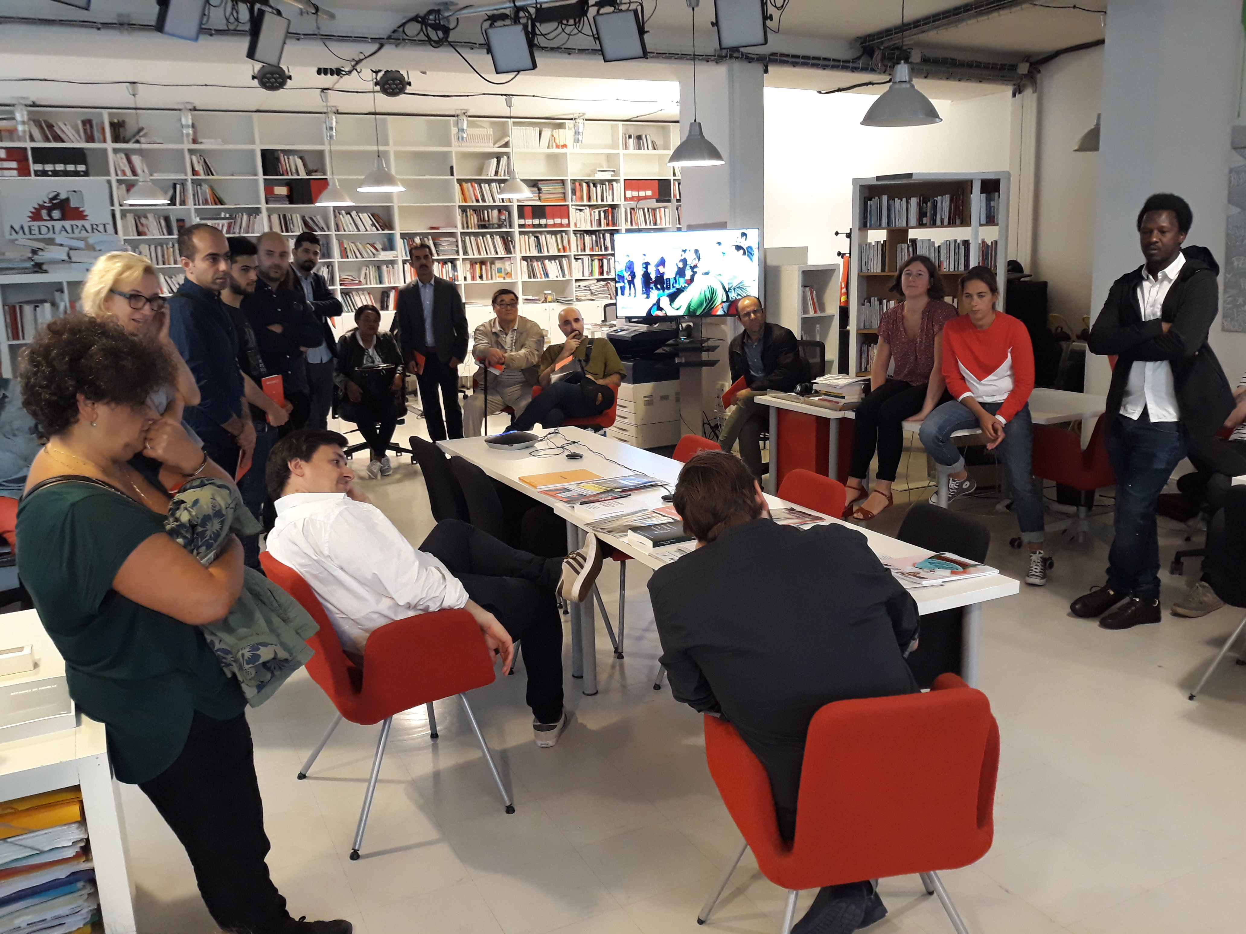 Ensuite, la délégation a été invitée à prendre place dans la salle des réunions, au cœur du bâtiment, pour assister à la réunion de rédaction qui a lieu tous les matins vers 11 heures. Les journalistes en exil ont pu ainsi prendre la parole pour se présenter à toute l’équipe du journal, une vingtaine de rédacteurs sur place et d’autres assistant en direct live dans les deux autres rédactions du média, à Poitiers et à Montpellier. Cet échange s’est par ailleurs déroulé en presence du directeur Edwy Plenel, avec lequel la visite a continué dans l’espace de réunion au 3e étage, pour une conversation informelle autour d’un café.