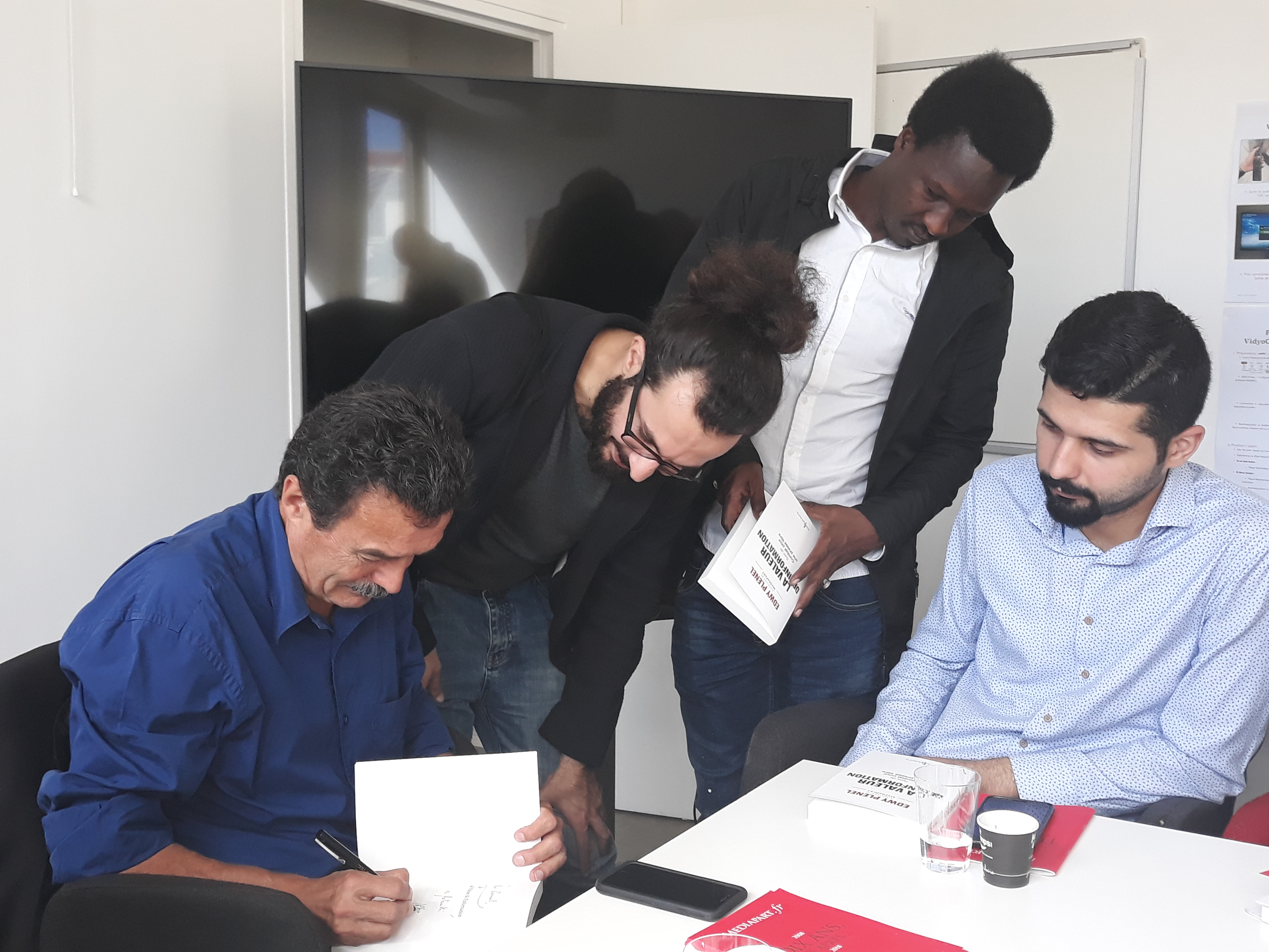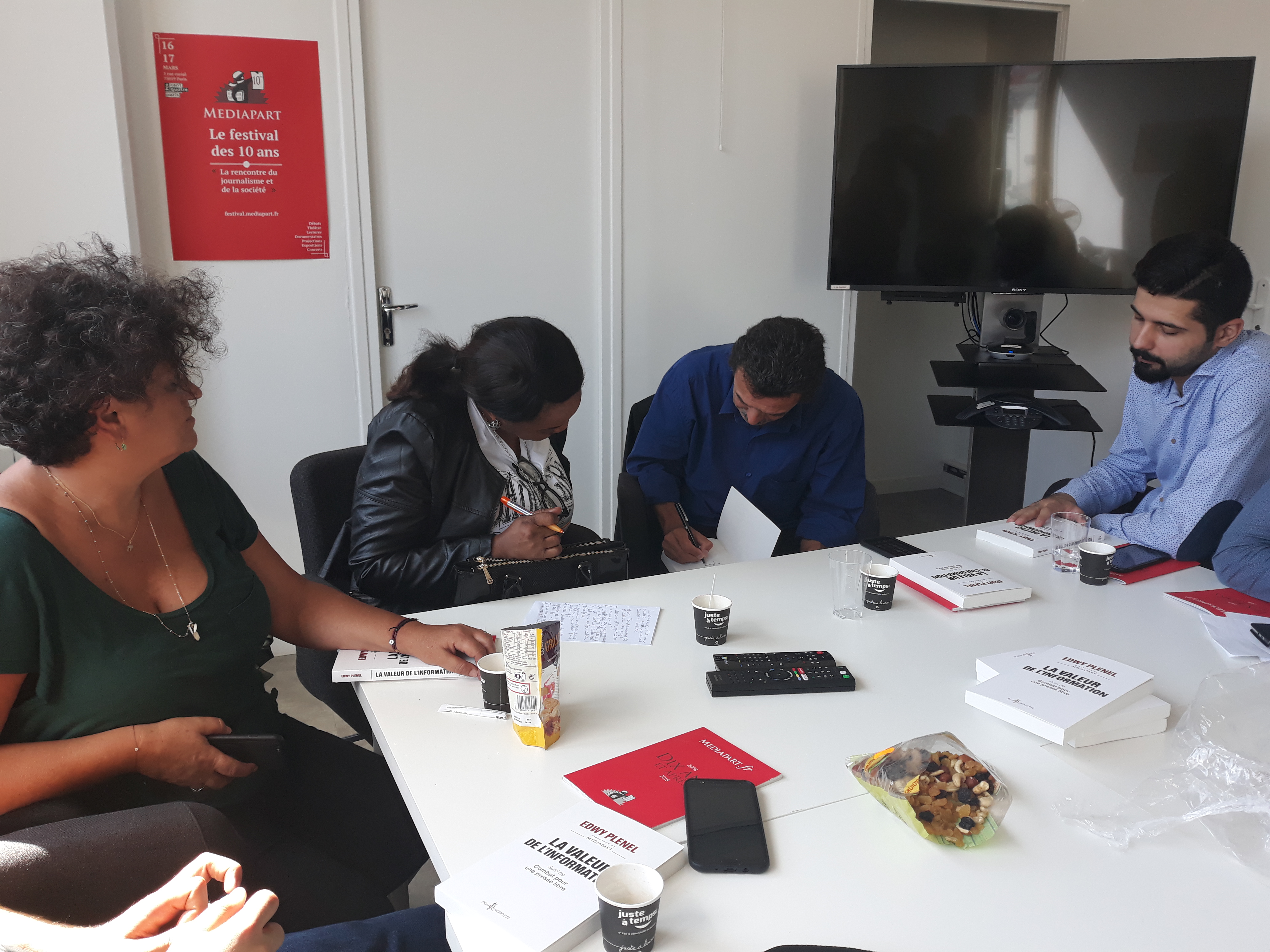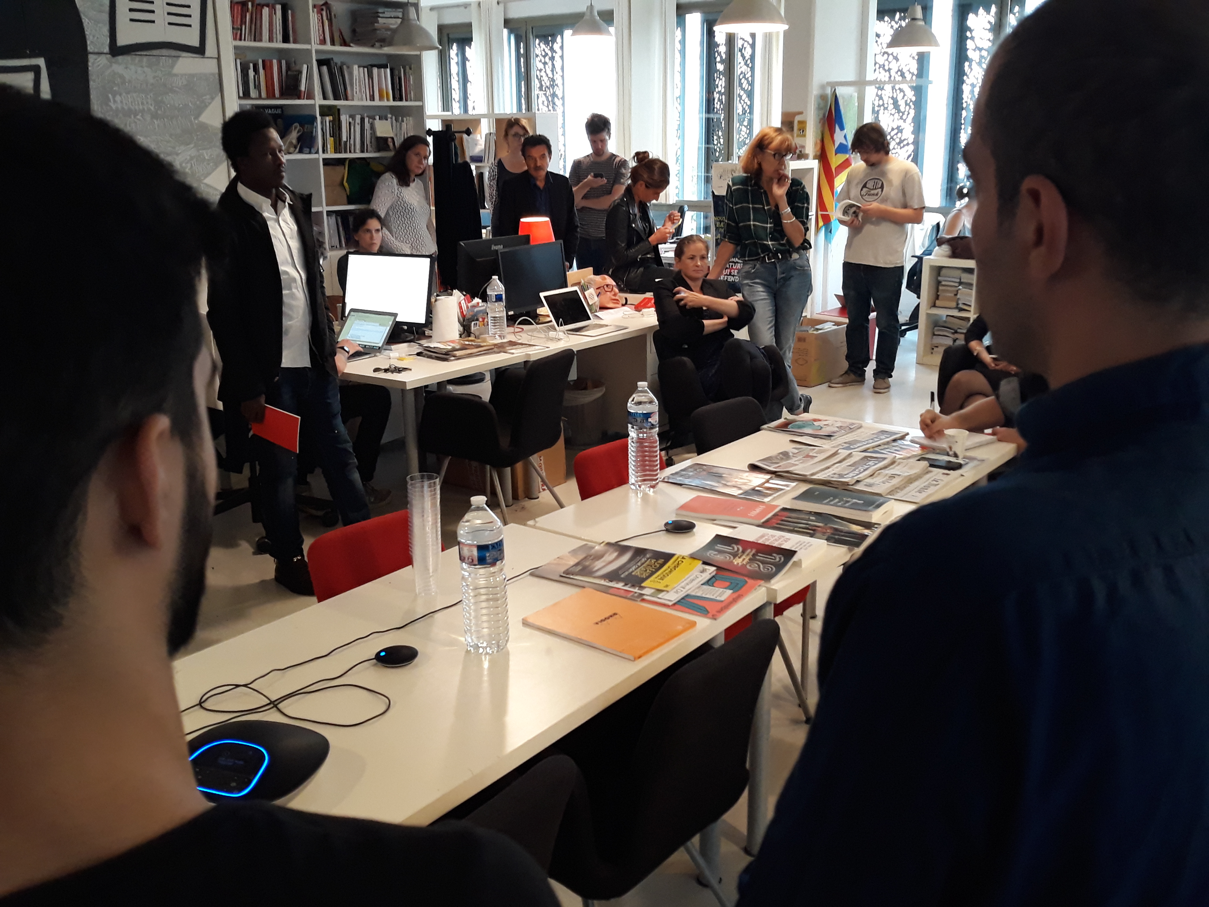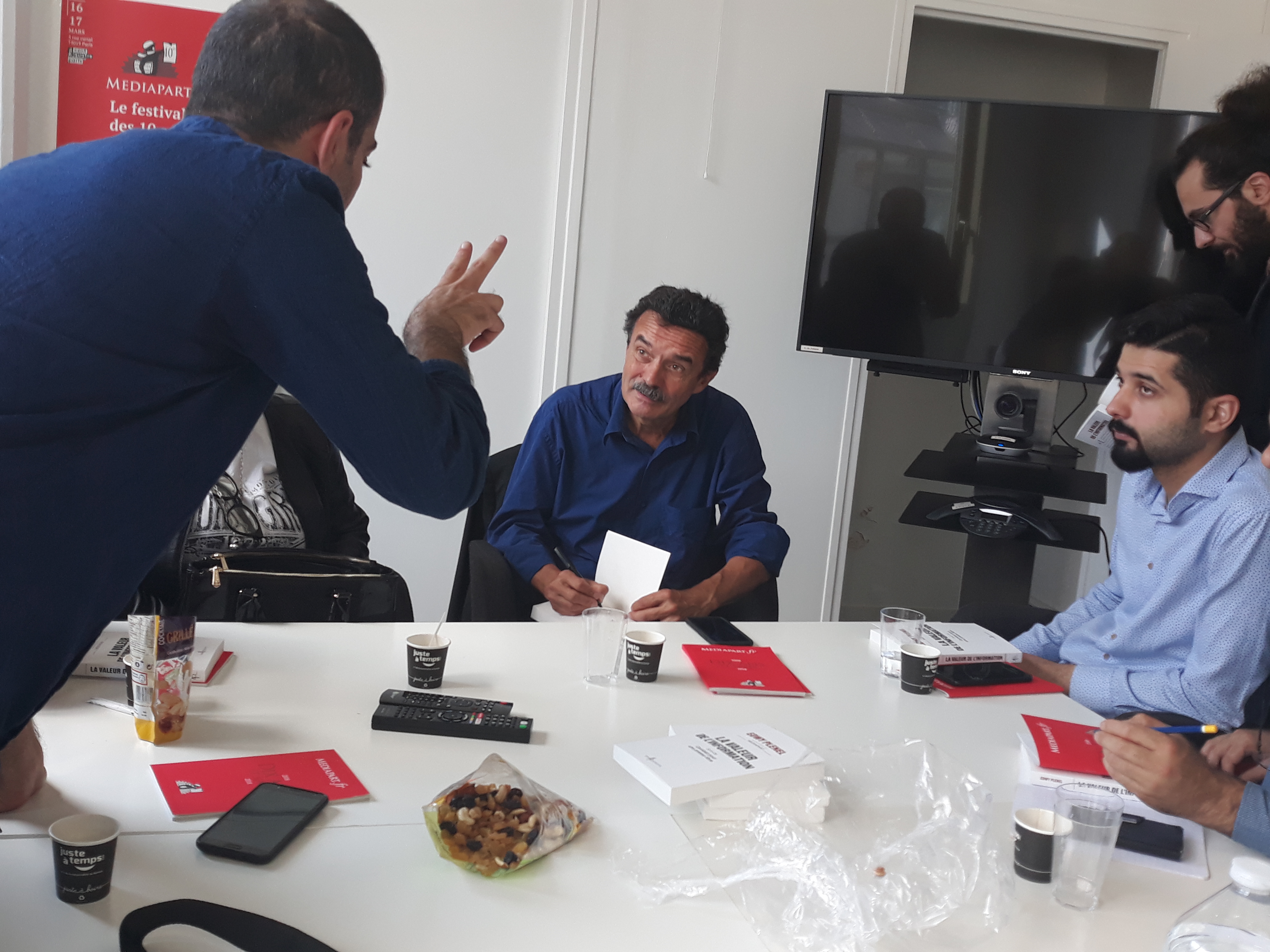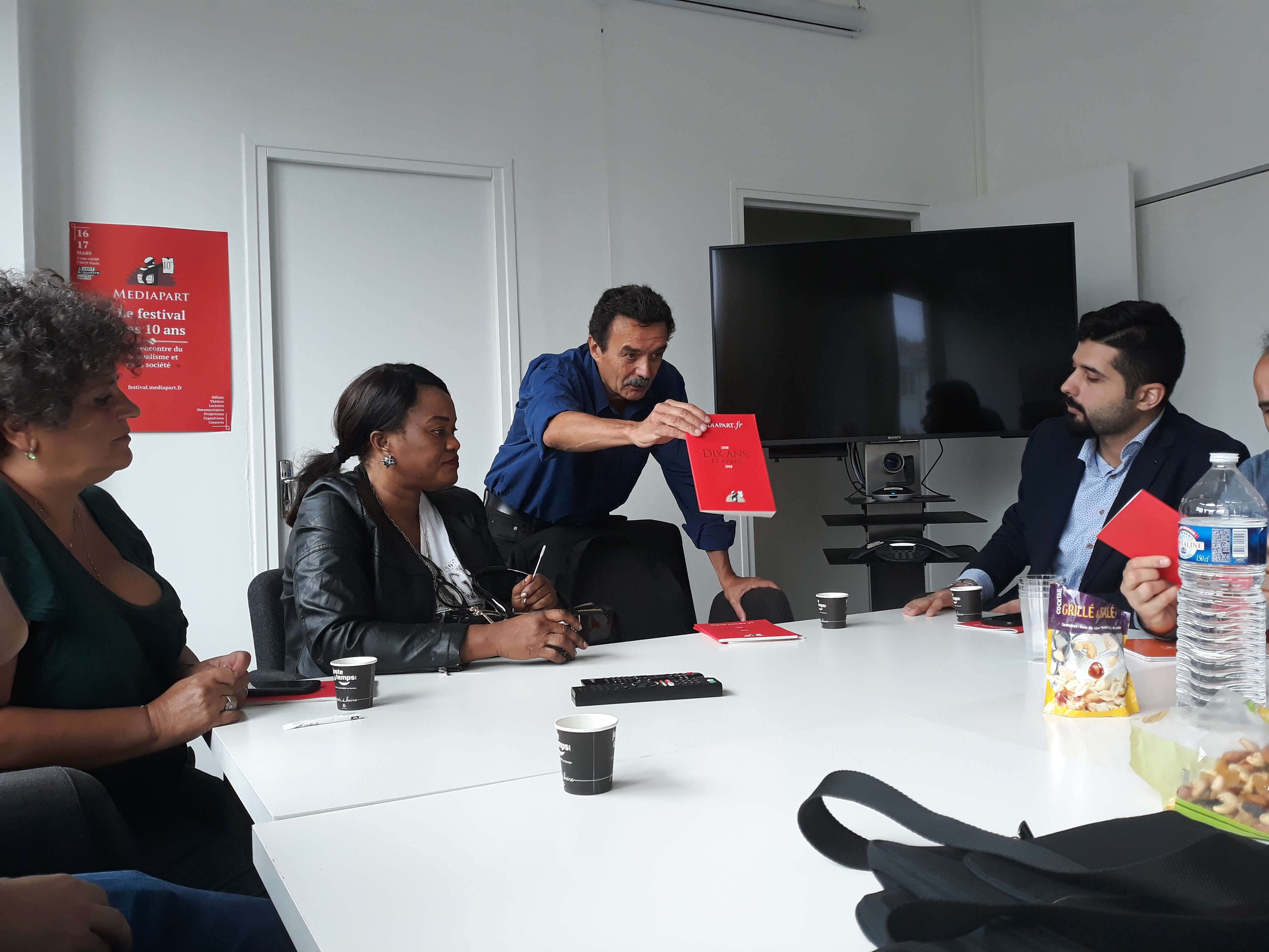 Ensuite, la délégation a été invitée à prendre place dans la salle des réunions, au cœur du bâtiment, pour assister à la réunion de rédaction qui a lieu tous les matins vers 11 heures. Les journalistes en exil ont pu ainsi prendre la parole pour se présenter à toute l’équipe du journal, une vingtaine de rédacteurs sur place et d’autres assistant en direct live dans les deux autres rédactions du média, à Poitiers et à Montpellier. Cet échange s’est par ailleurs déroulé en presence du directeur Edwy Plenel, avec lequel la visite a continué dans l’espace de réunion au 3e étage, pour une conversation informelle autour d’un café.