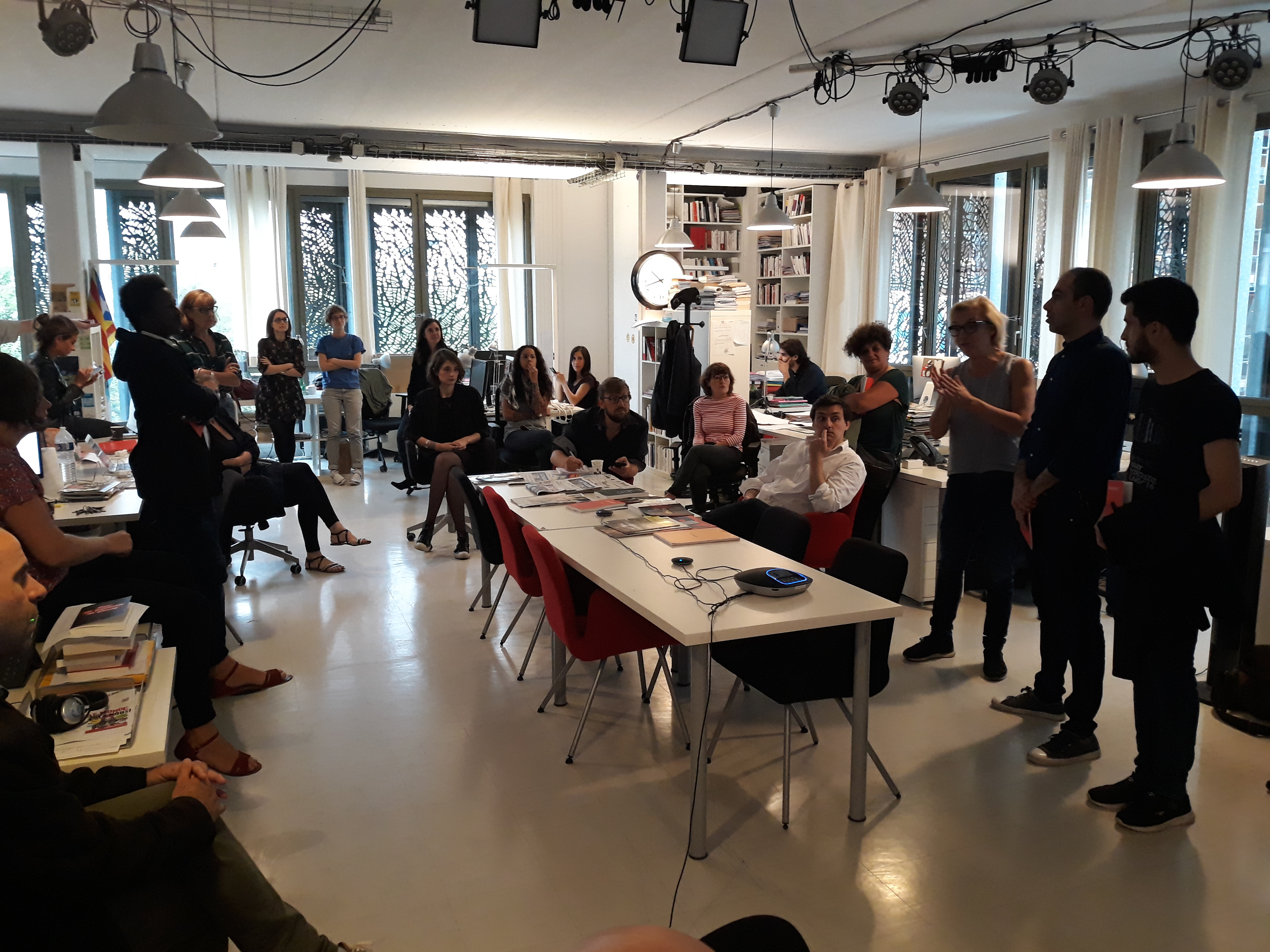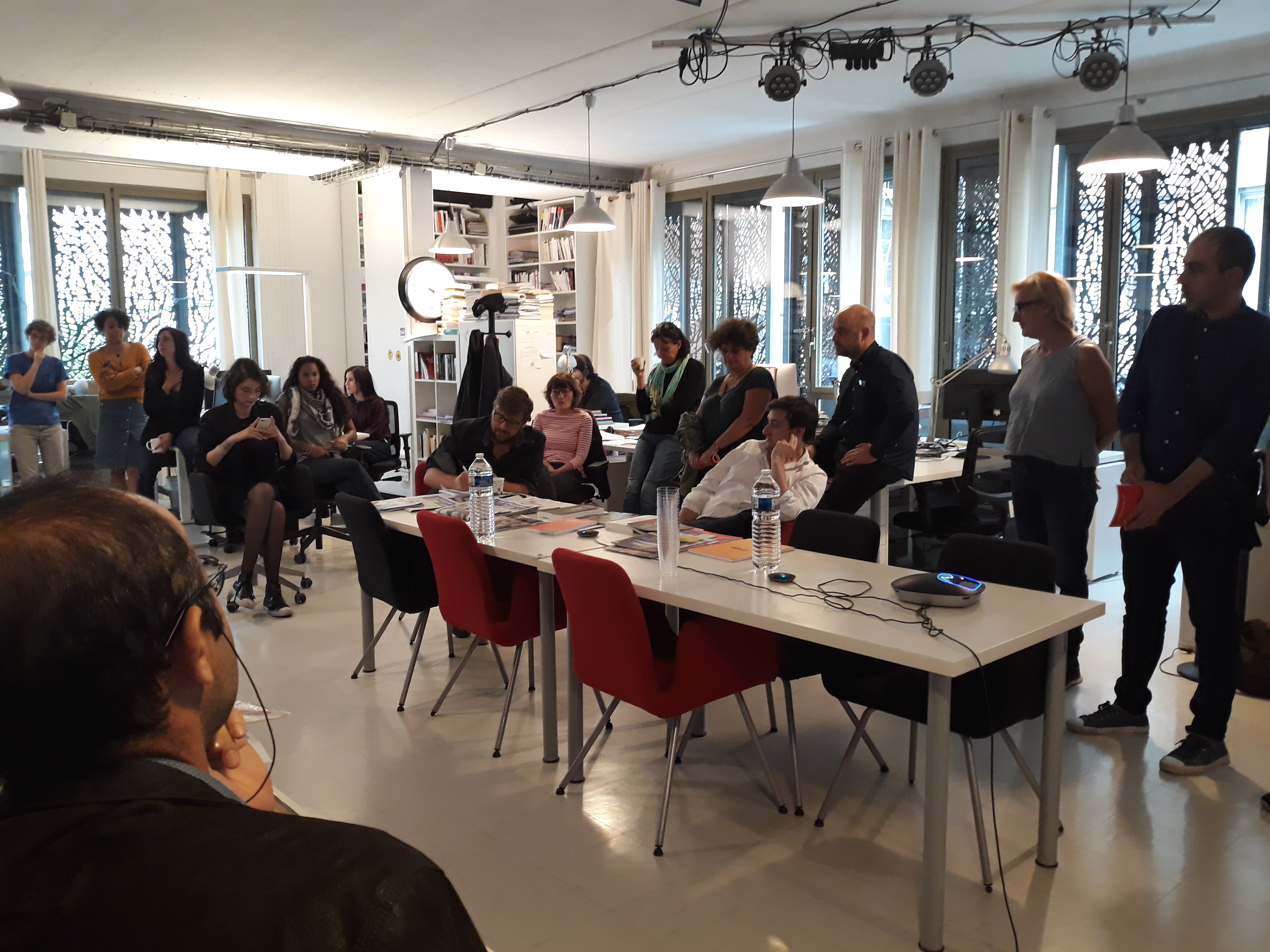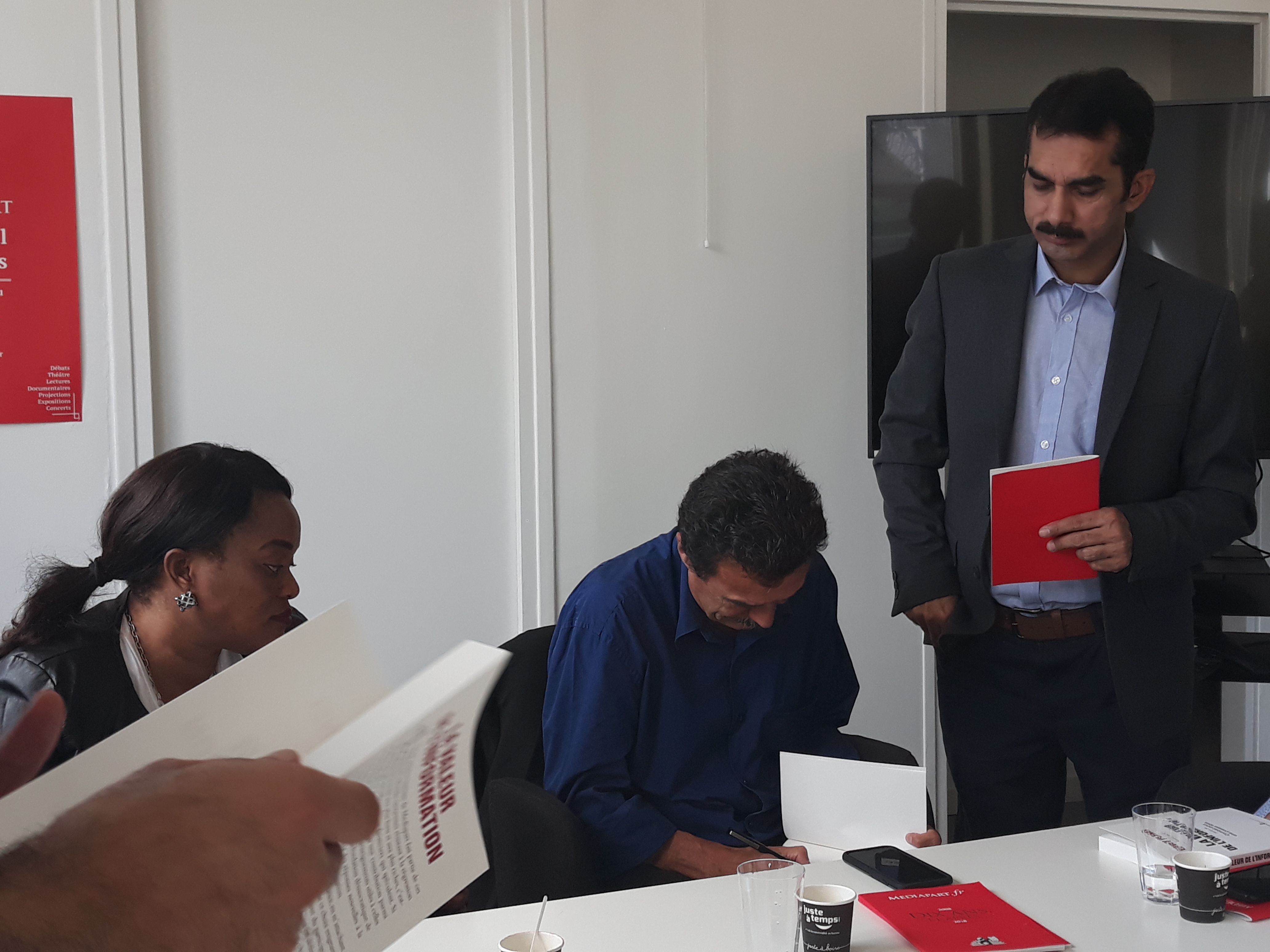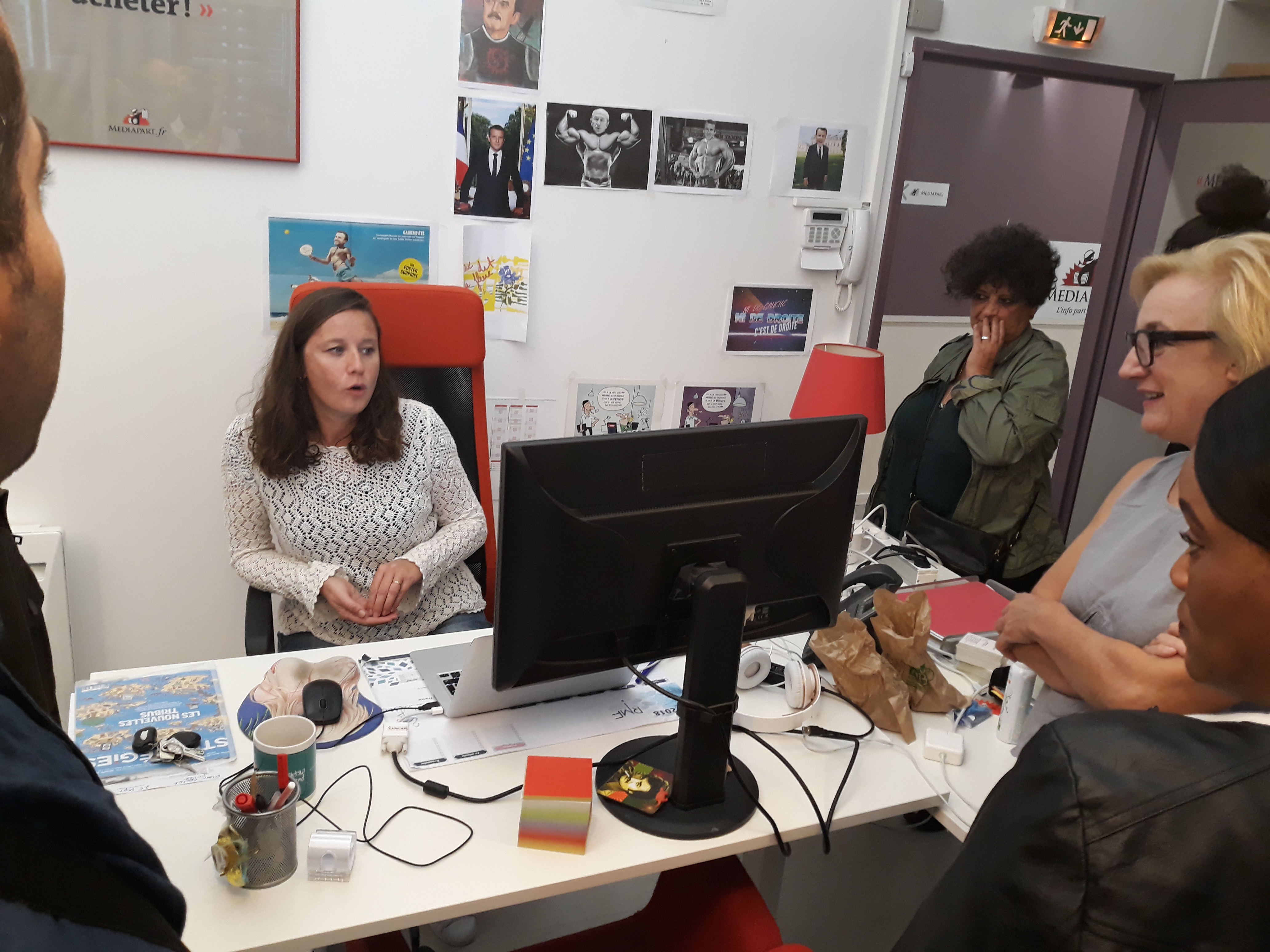 Ensuite, la délégation a été invitée à prendre place dans la salle des réunions, au cœur du bâtiment, pour assister à la réunion de rédaction qui a lieu tous les matins vers 11 heures. Les journalistes en exil ont pu ainsi prendre la parole pour se présenter à toute l’équipe du journal, une vingtaine de rédacteurs sur place et d’autres assistant en direct live dans les deux autres rédactions du média, à Poitiers et à Montpellier. Cet échange s’est par ailleurs déroulé en presence du directeur Edwy Plenel, avec lequel la visite a continué dans l’espace de réunion au 3e étage, pour une conversation informelle autour d’un café.