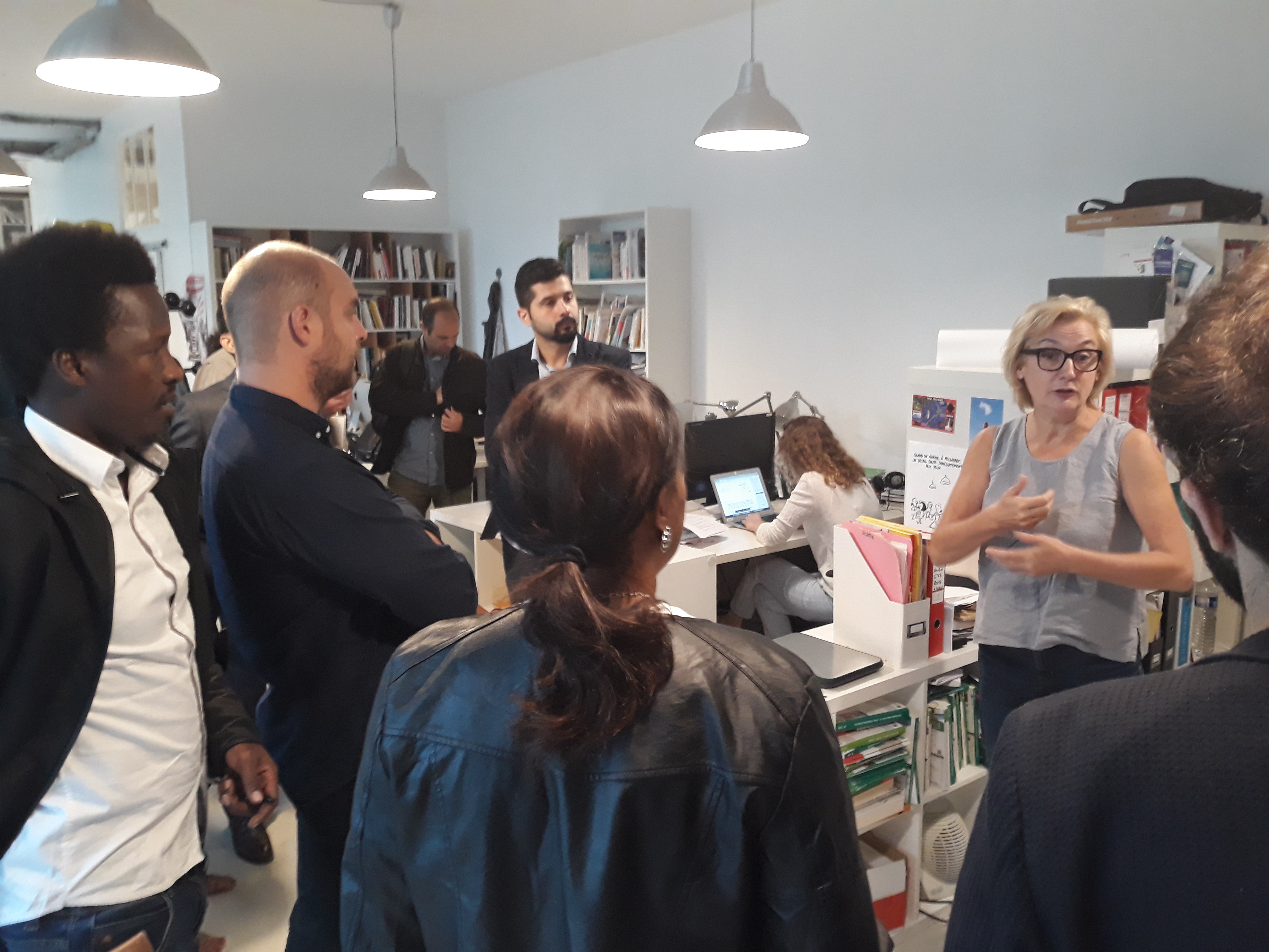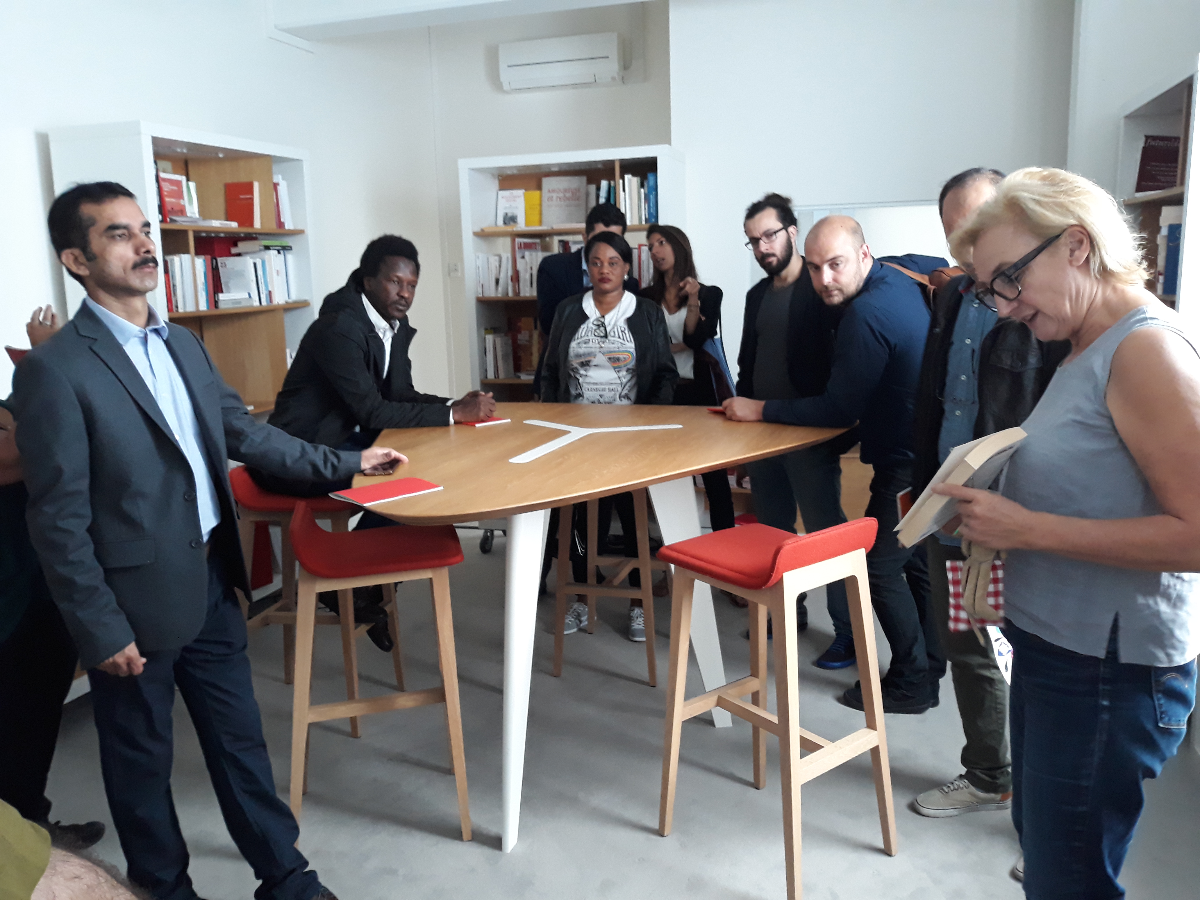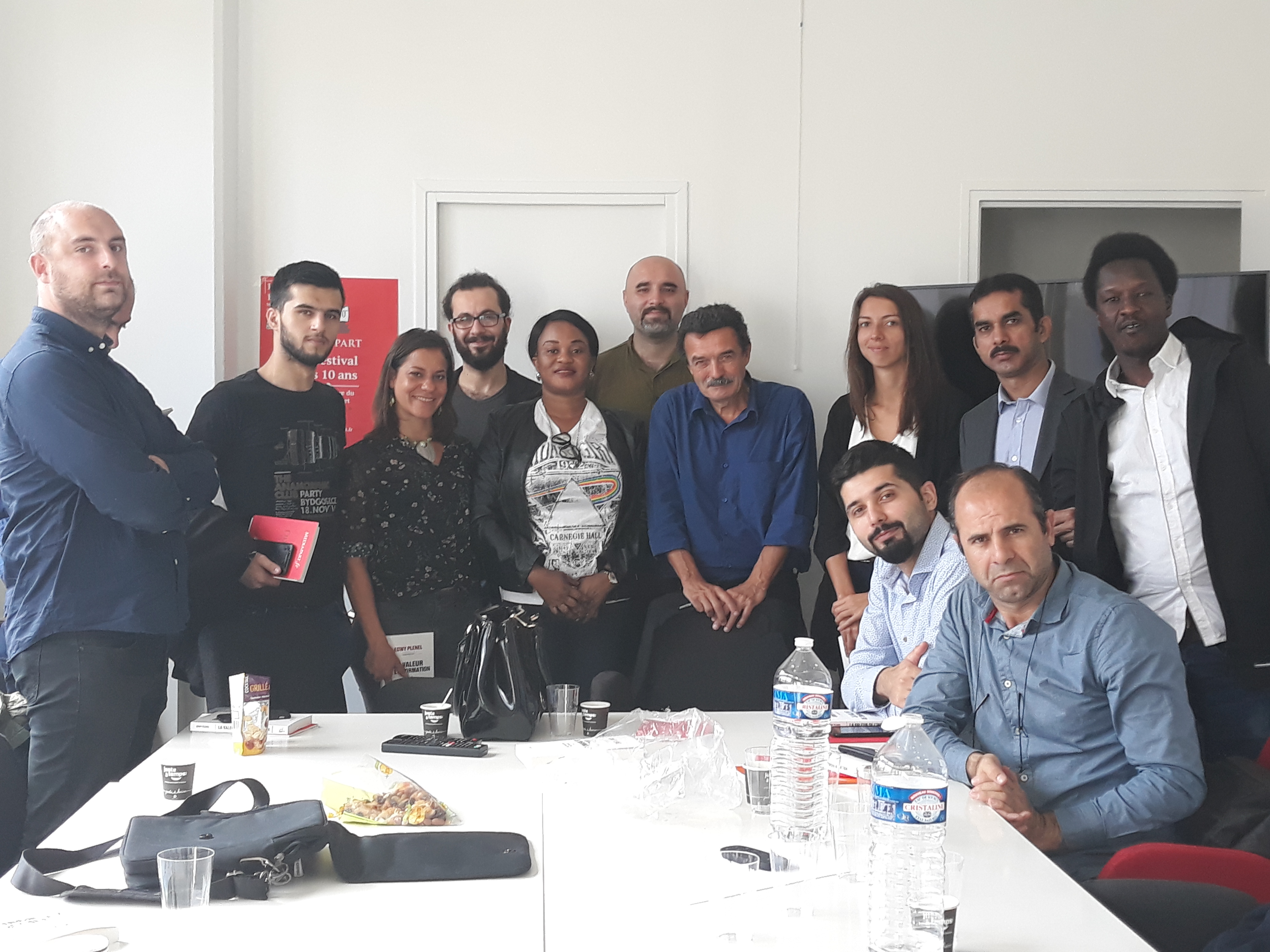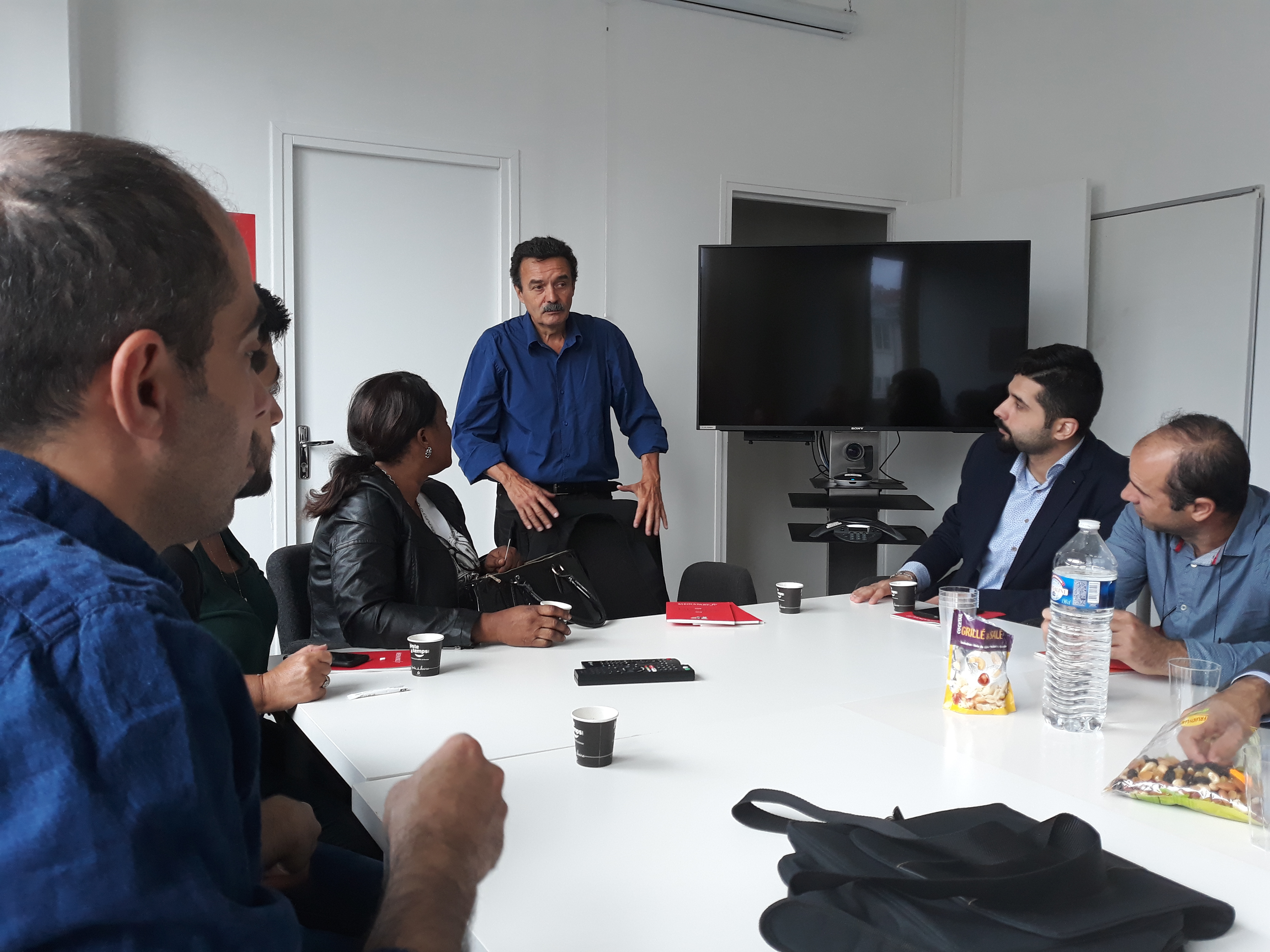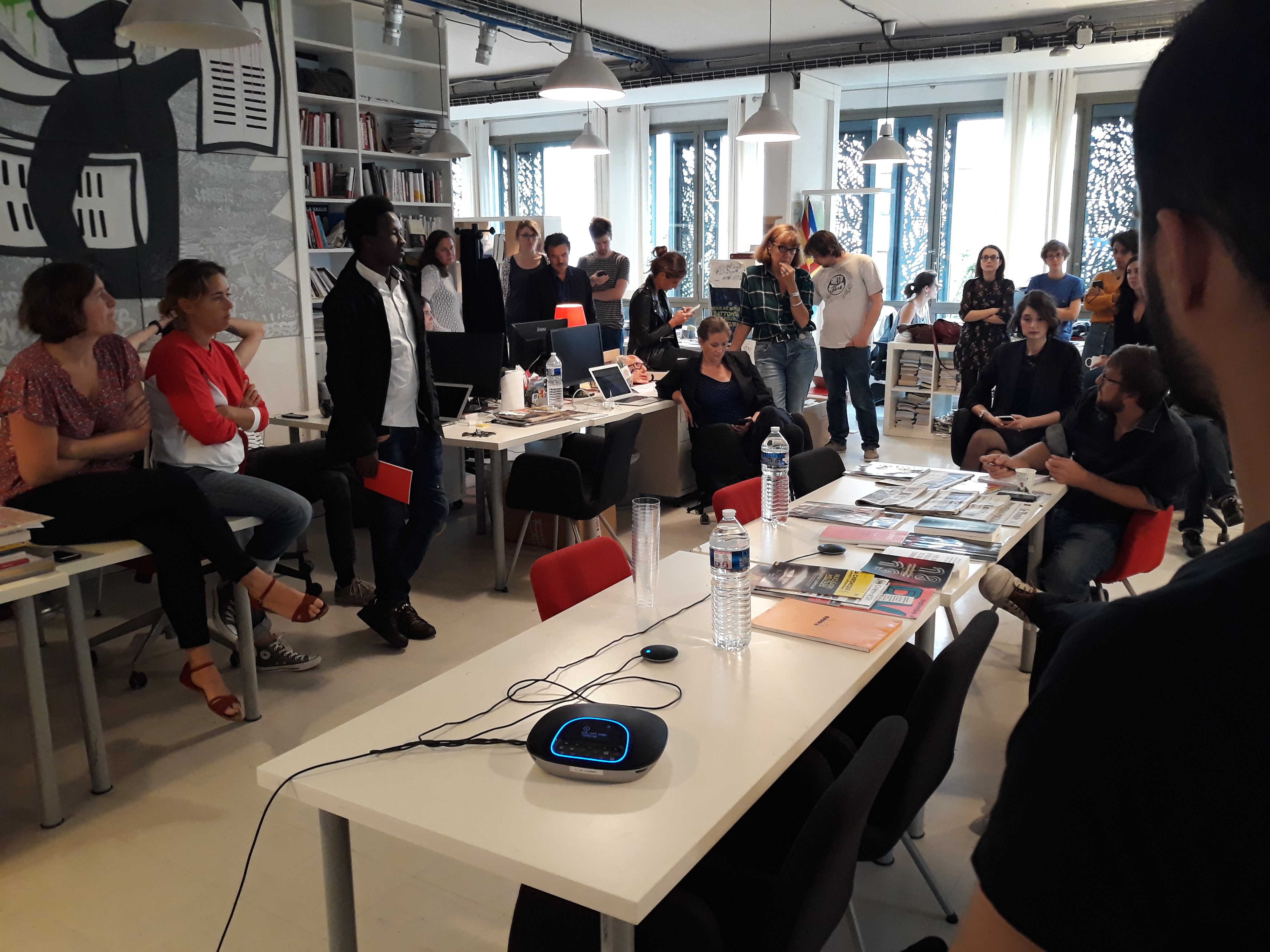Ensuite, la délégation a été invitée à prendre place dans la salle des réunions, au cœur du bâtiment, pour assister à la réunion de rédaction qui a lieu tous les matins vers 11 heures. Les journalistes en exil ont pu ainsi prendre la parole pour se présenter à toute l’équipe du journal, une vingtaine de rédacteurs sur place et d’autres assistant en direct live dans les deux autres rédactions du média, à Poitiers et à Montpellier. Cet échange s’est par ailleurs déroulé en presence du directeur Edwy Plenel, avec lequel la visite a continué dans l’espace de réunion au 3e étage, pour une conversation informelle autour d’un café.