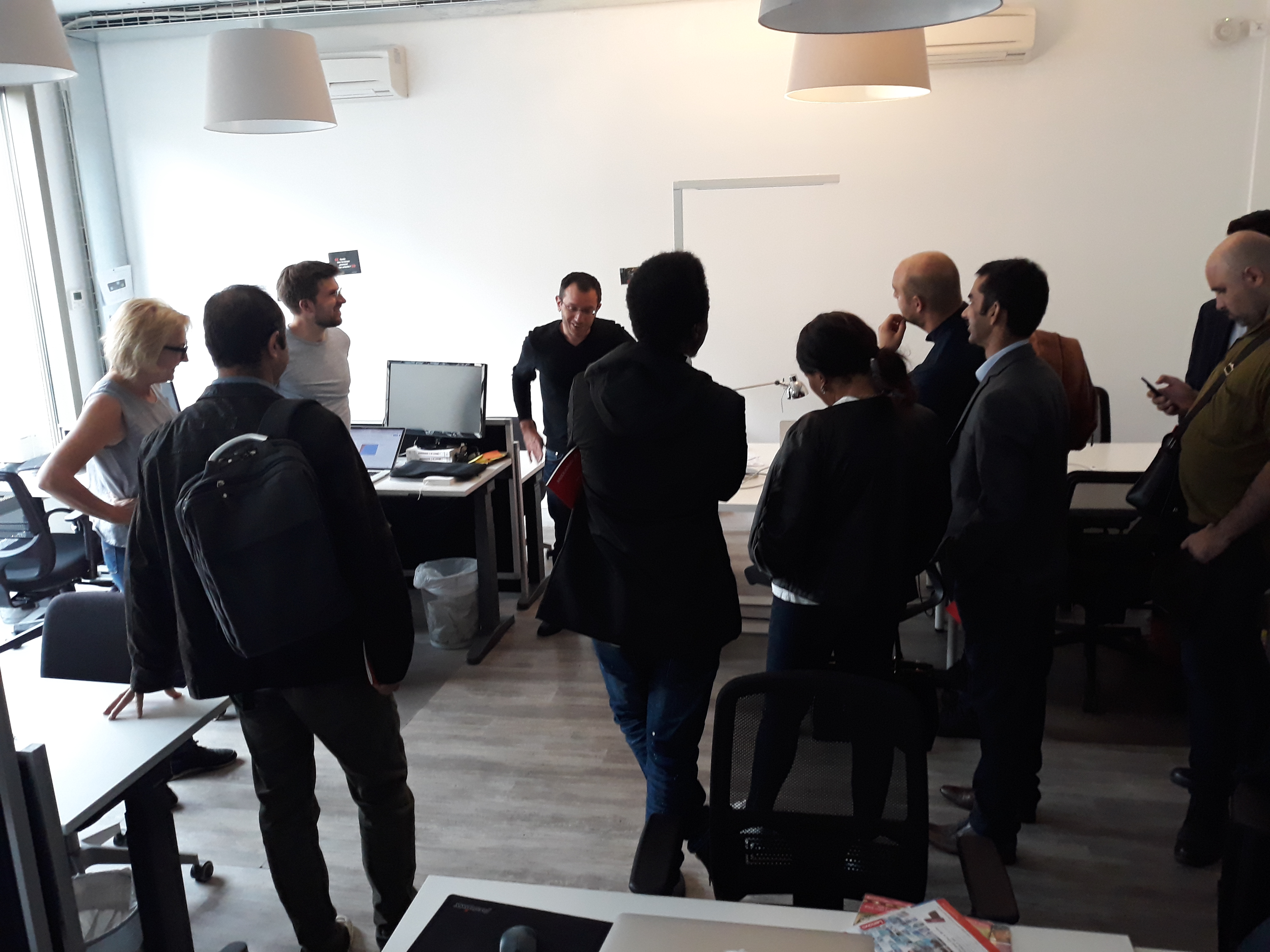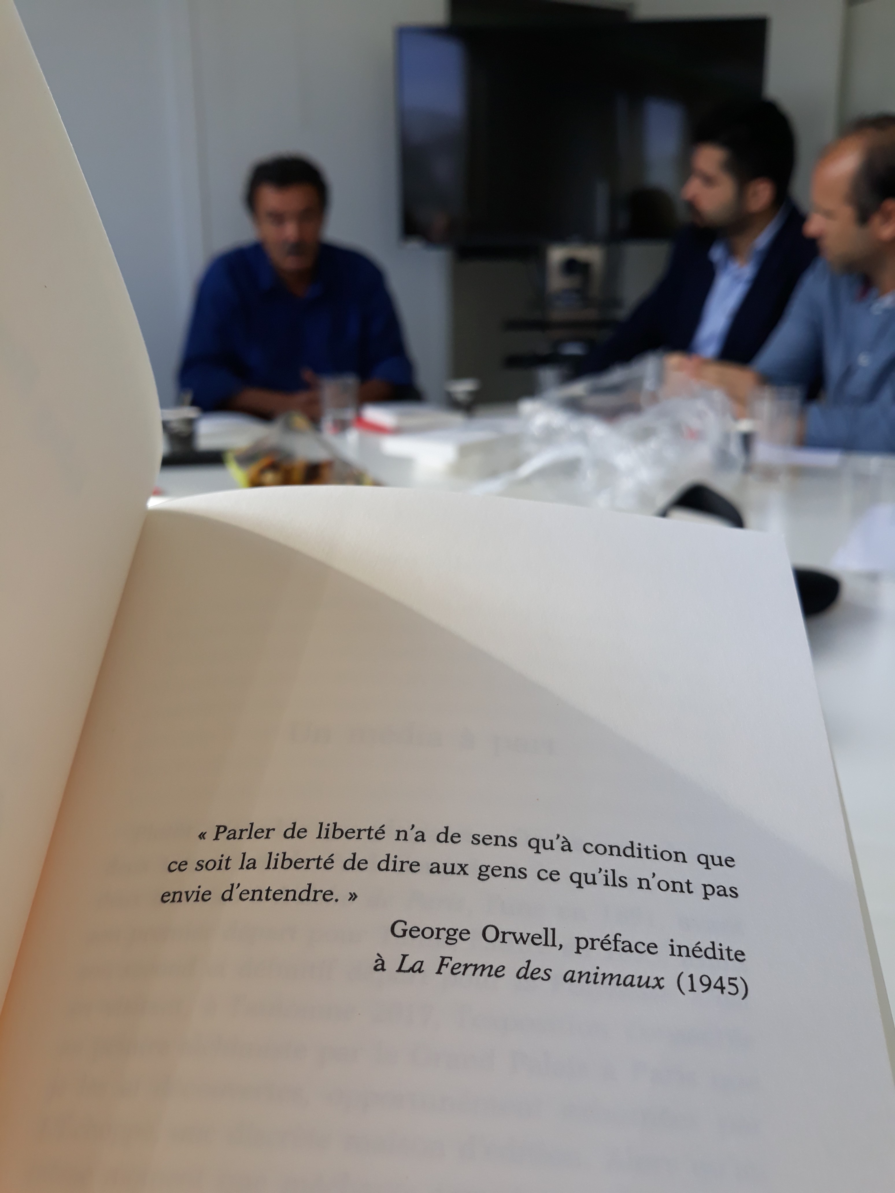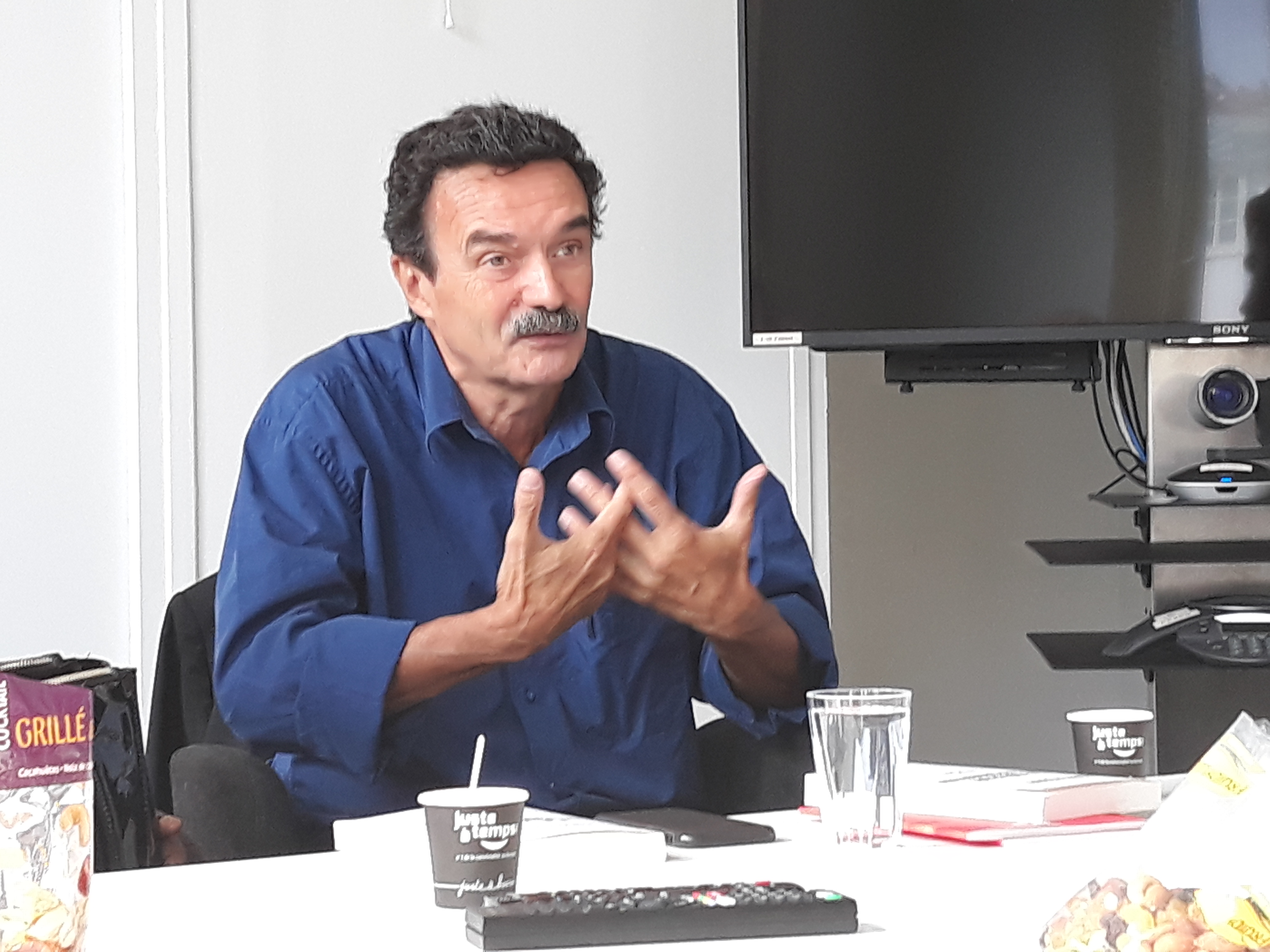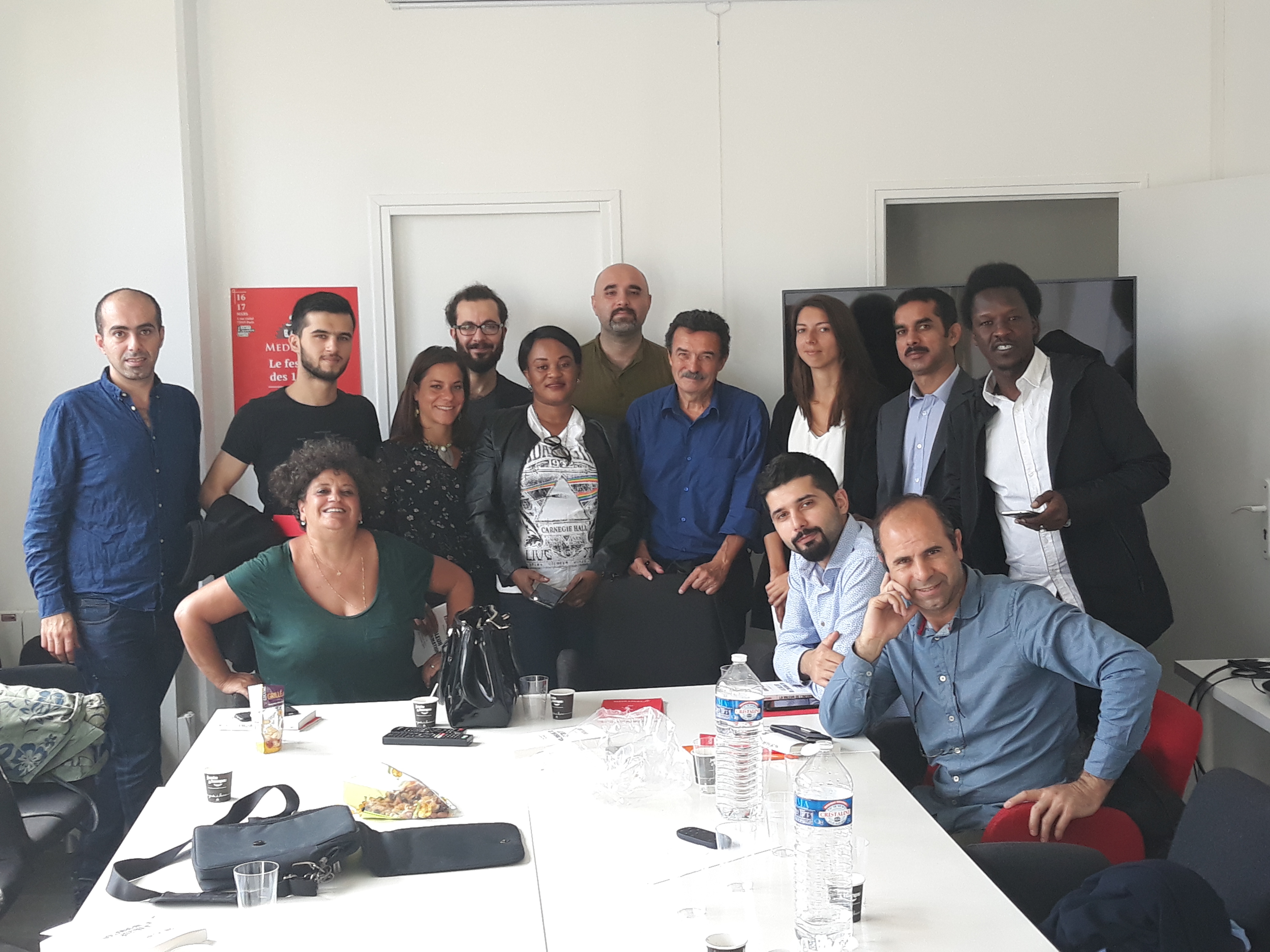 Ensuite, la délégation a été invitée à prendre place dans la salle des réunions, au cœur du bâtiment, pour assister à la réunion de rédaction qui a lieu tous les matins vers 11 heures. Les journalistes en exil ont pu ainsi prendre la parole pour se présenter à toute l’équipe du journal, une vingtaine de rédacteurs sur place et d’autres assistant en direct live dans les deux autres rédactions du média, à Poitiers et à Montpellier. Cet échange s’est par ailleurs déroulé en presence du directeur Edwy Plenel, avec lequel la visite a continué dans l’espace de réunion au 3e étage, pour une conversation informelle autour d’un café.