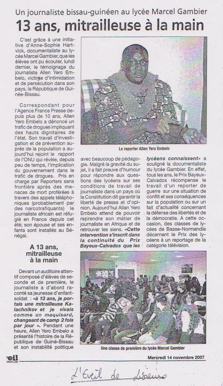 Le lycée Gambier a accueilli Allen Yero Embalo, journaliste en Guinée-Bissau. Il a fuit son pays et est venu témoigner comme « Renvoyé Spécial ». Dans son pays, la Guinée-Bissau Allen, correspondant pour l’AFP et Radio France, enquêtait sur les narco-trafiquants. «Un jour, des hommes cagoulés sont venus chez moi, ils se sont rendus dans mon bureau, m’ont volé mes ordinateurs, mes deux caméras, mes archives vidéos, tout ! Quand je suis rentré, ils avaient laissé un mot : « la prochaine fois, on emportera ta tête » ».